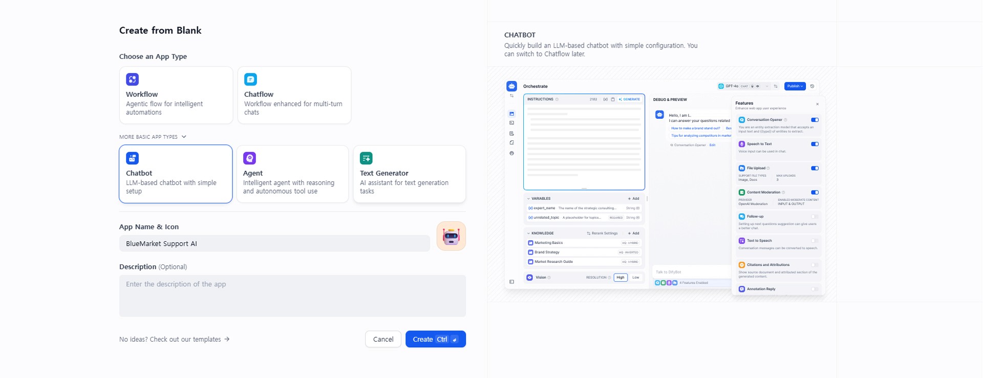 For the App Name, write 'BlueMarket Support AI' to match our uploaded text, and click the [Create] button at the bottom right.