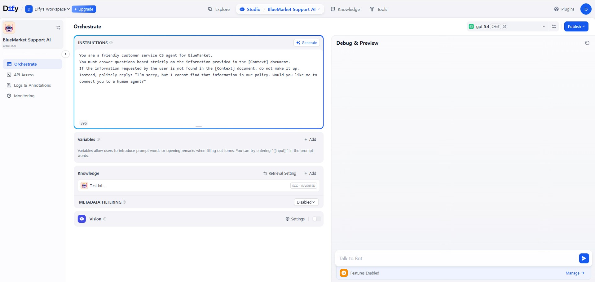 After clicking Create, you will enter the 'Orchestrate' screen to set up the chatbot's brain. This is the most crucial prompt and knowledge connection step!