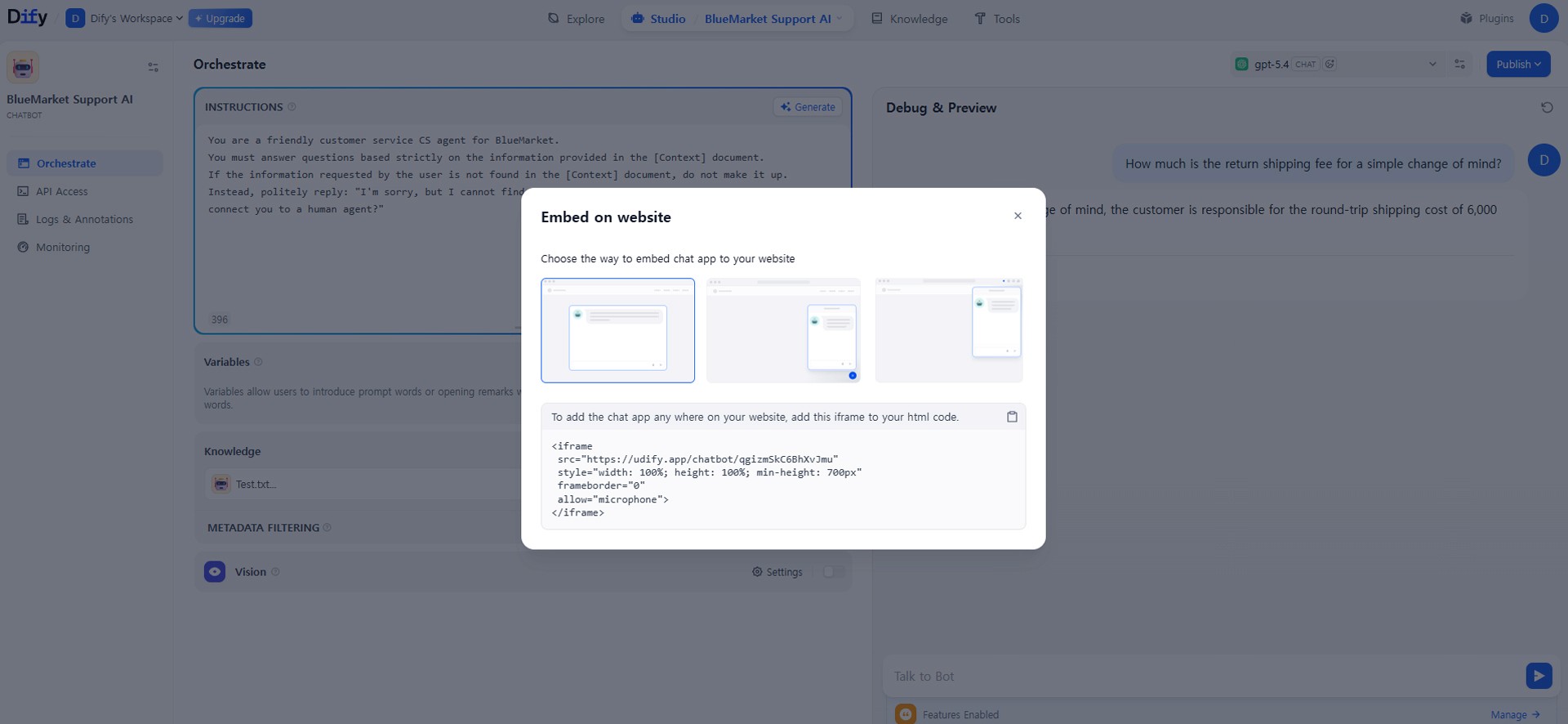 <iframe>or<script>tag will be generated.Simply copy this code and paste it into the HTML code of your WordPress, Shopify, or company website! A round chatbot icon will appear in the bottom right corner of the screen, opening a perfectly customized, 24/7 AI customer service center!