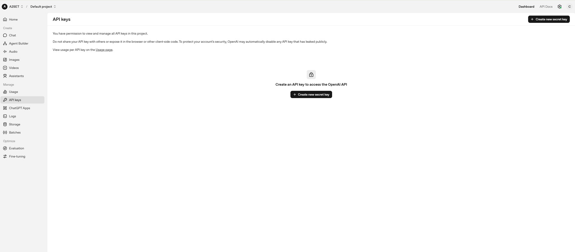 On the left padlock menu (API keys), click [Create new secret key] to generate a new API key (starting with
