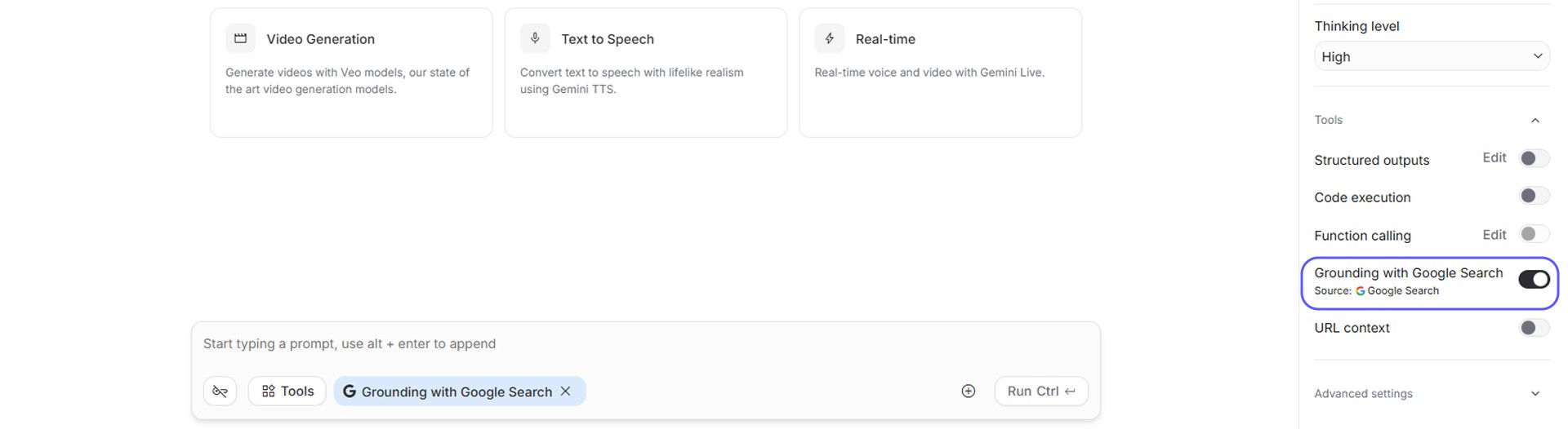 Among the list underneath, click the switch next to the 'Grounding with Google Search' feature to turn it on. The switch color will change to indicate it is active. (Note: As of 2026, even on the Free Tier, if you use the Gemini Flash model, you can use the Google Search tool for free up to 500 times a day!)