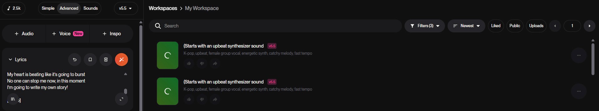 The moment you press the button, two completely different arranged versions will start generating simultaneously on the wide [My Workspace] screen on the right.