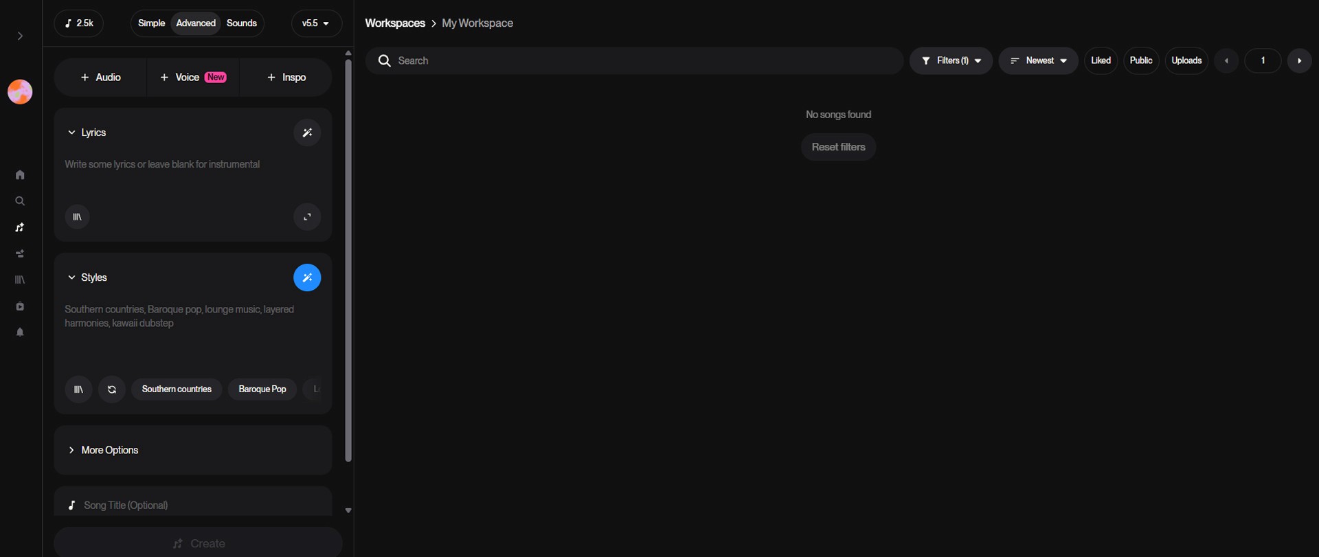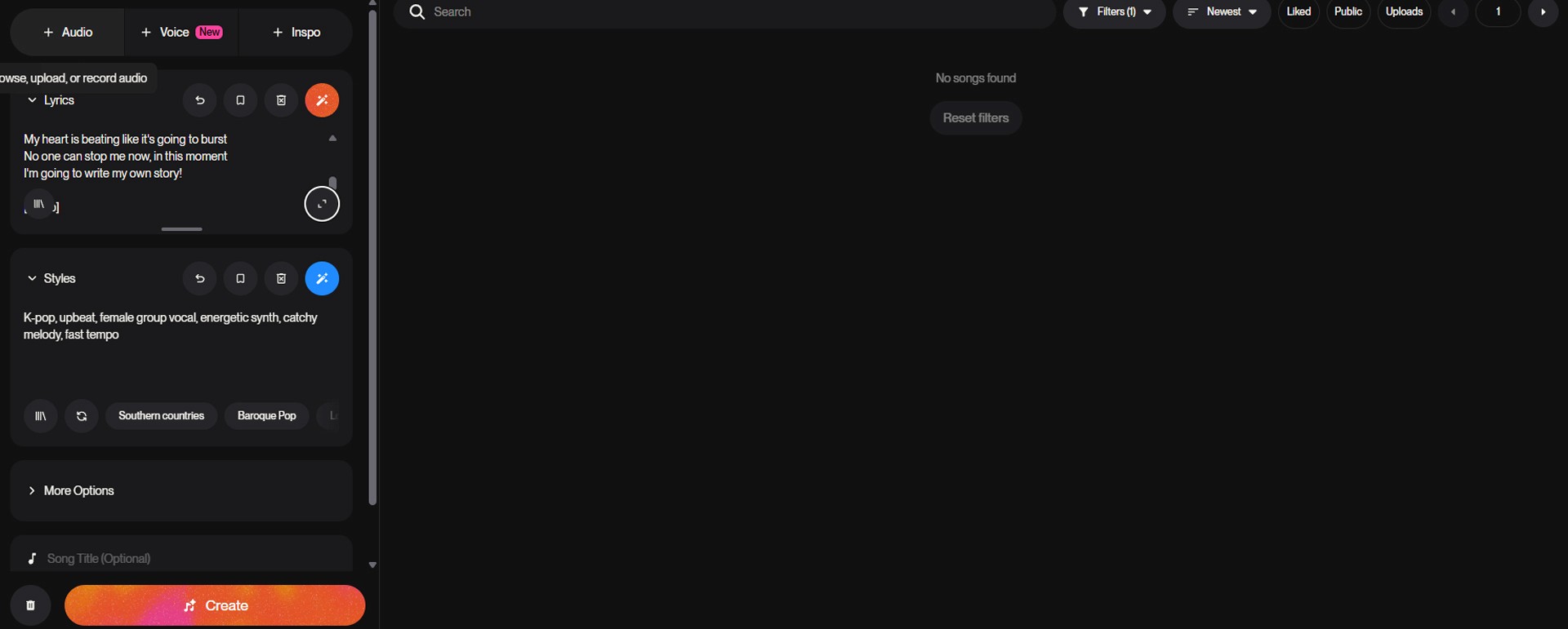 Right below the lyrics is the Styles input box, which determines the genre and mood of the song.