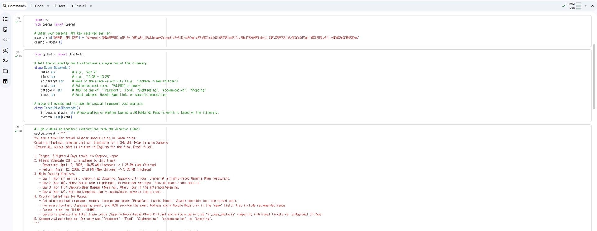 Open a new code cell, paste the script below, and hit play! The AI will calculate the optimal routes, search for restaurant menus/addresses, and build the timeline (takes about 15~20 seconds).