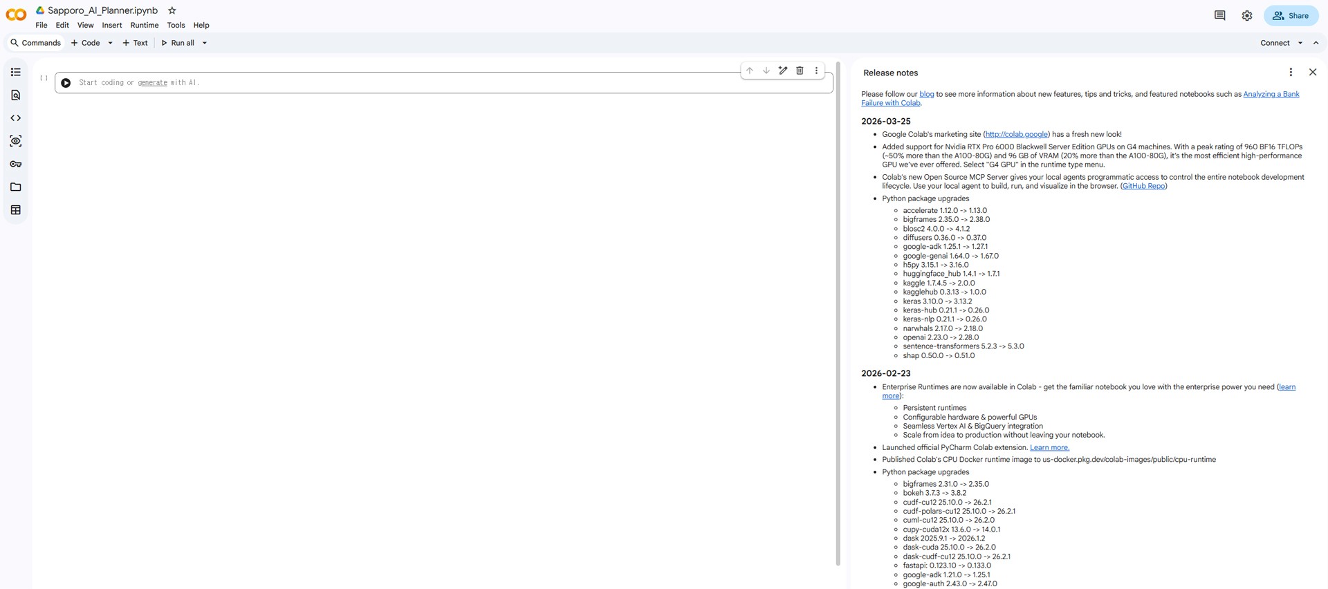 When the blank notebook opens, click the file name at the top left (e.g., Untitled0.ipynb) and elegantly rename it to Sapporo_Premium_Planner.ipynb.