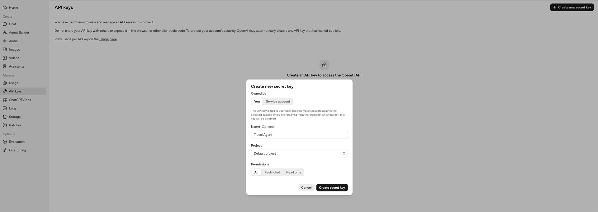 A long password starting with sk- will appear. You MUST copy and save this right now! (You won't be able to see it again).