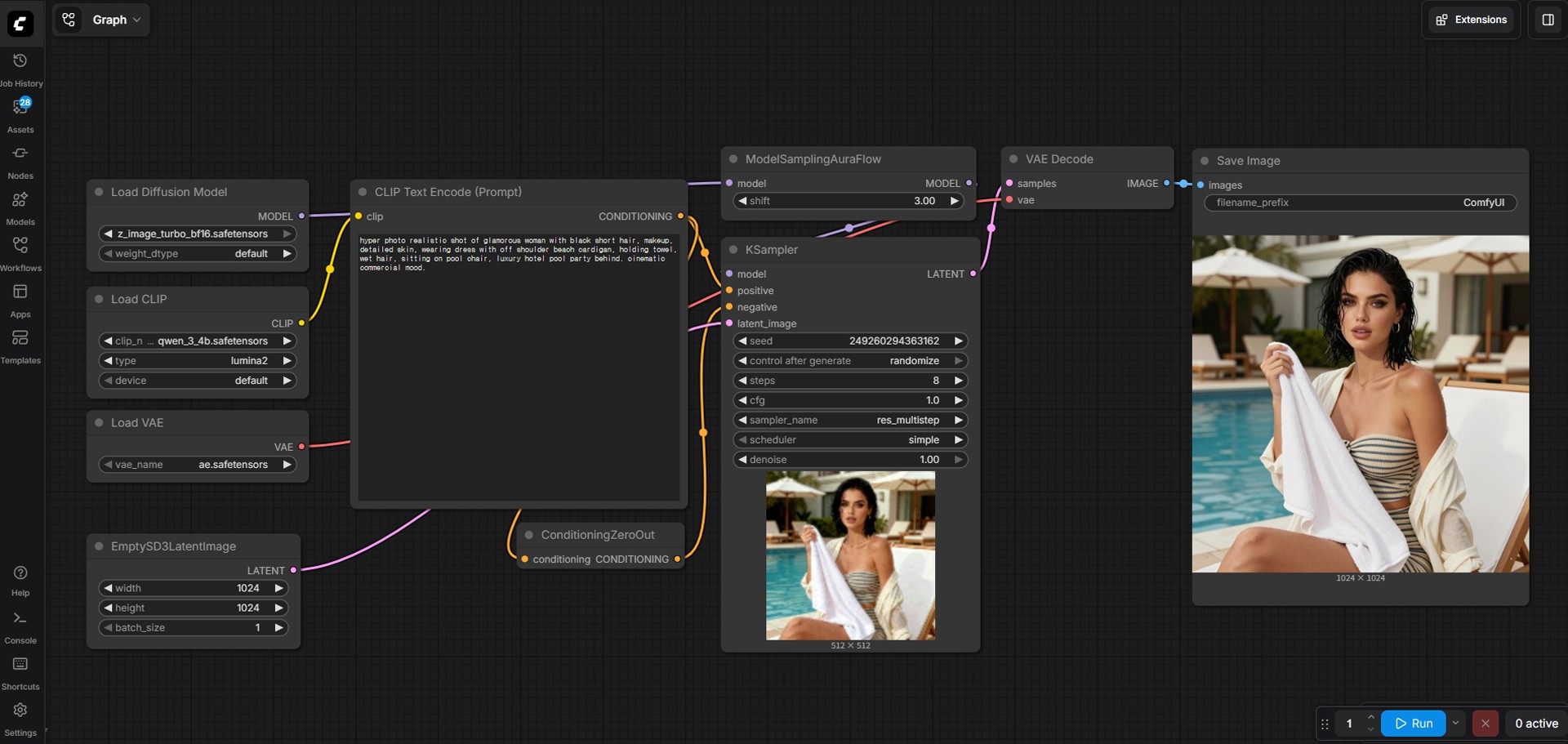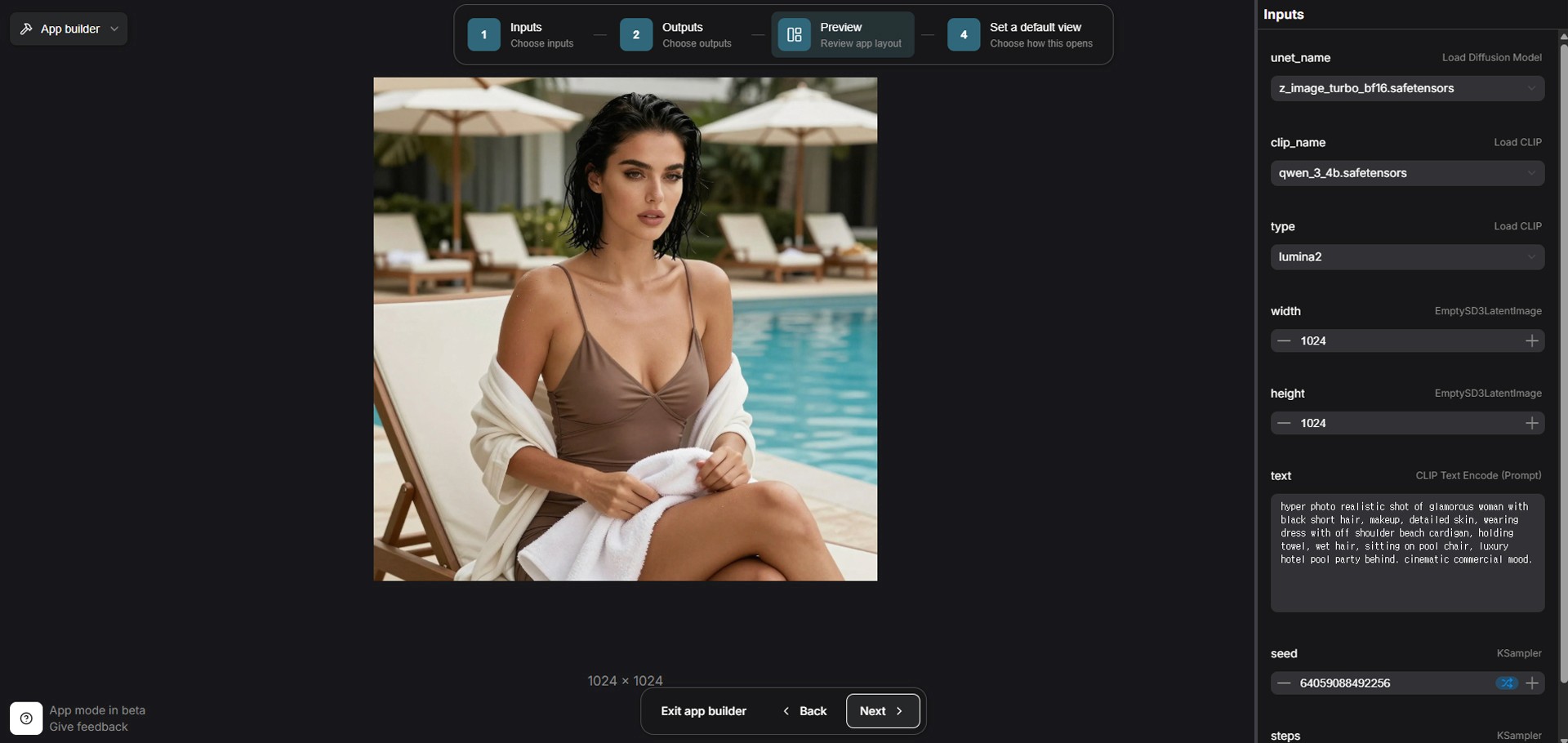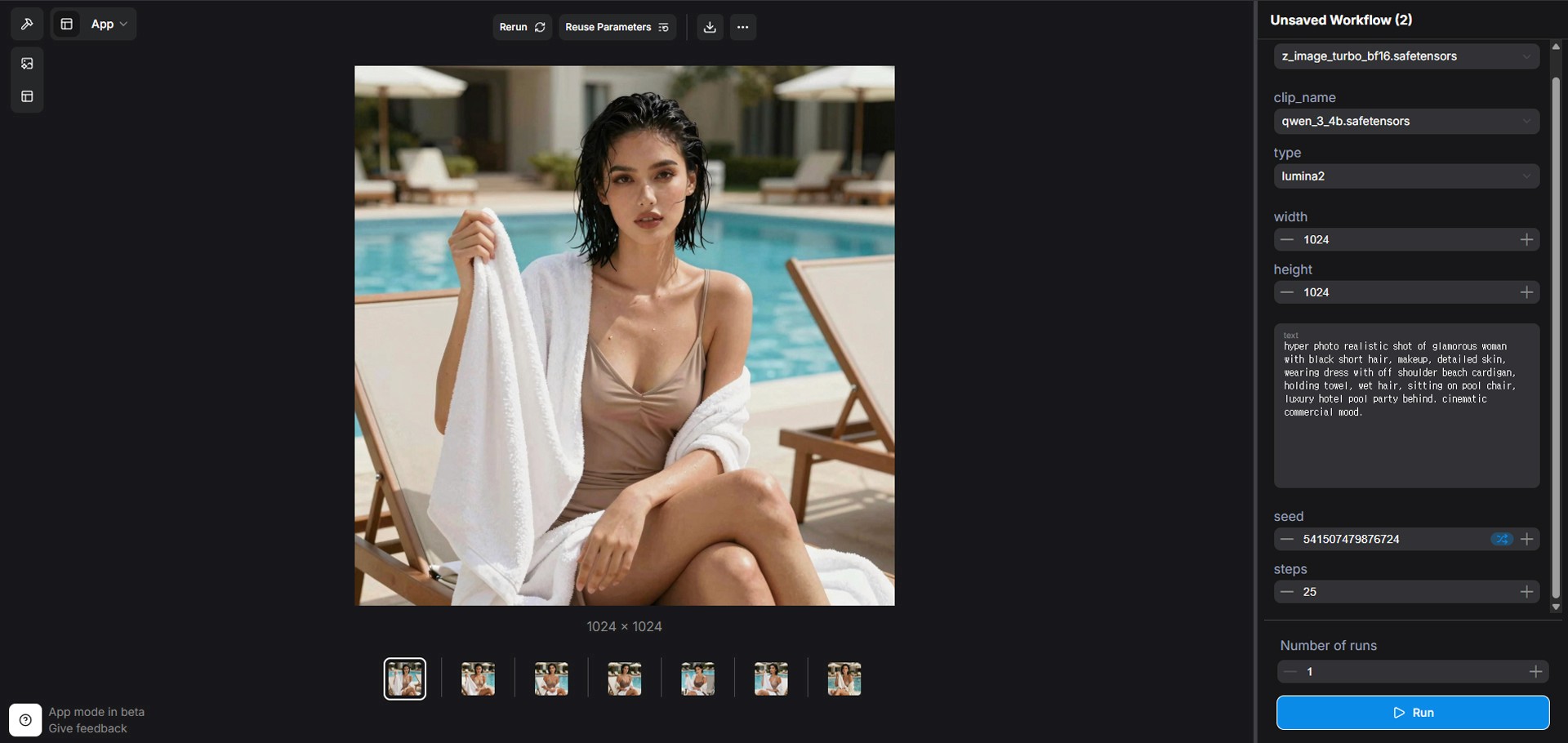 In the center of the screen, a large generated preview image appears, and on the right side, a Simplified Interface (App View) emerges, neatly arranging only the input boxes you picked out earlier (prompt box, width/height adjustment, seed number, etc.).