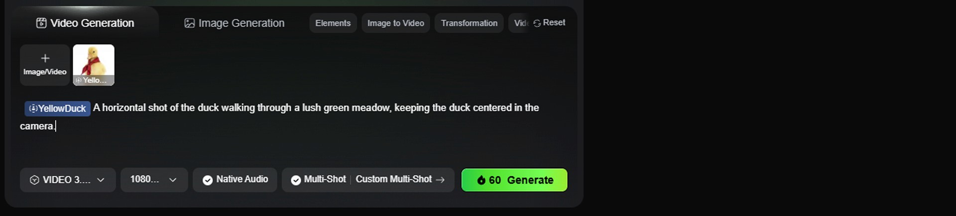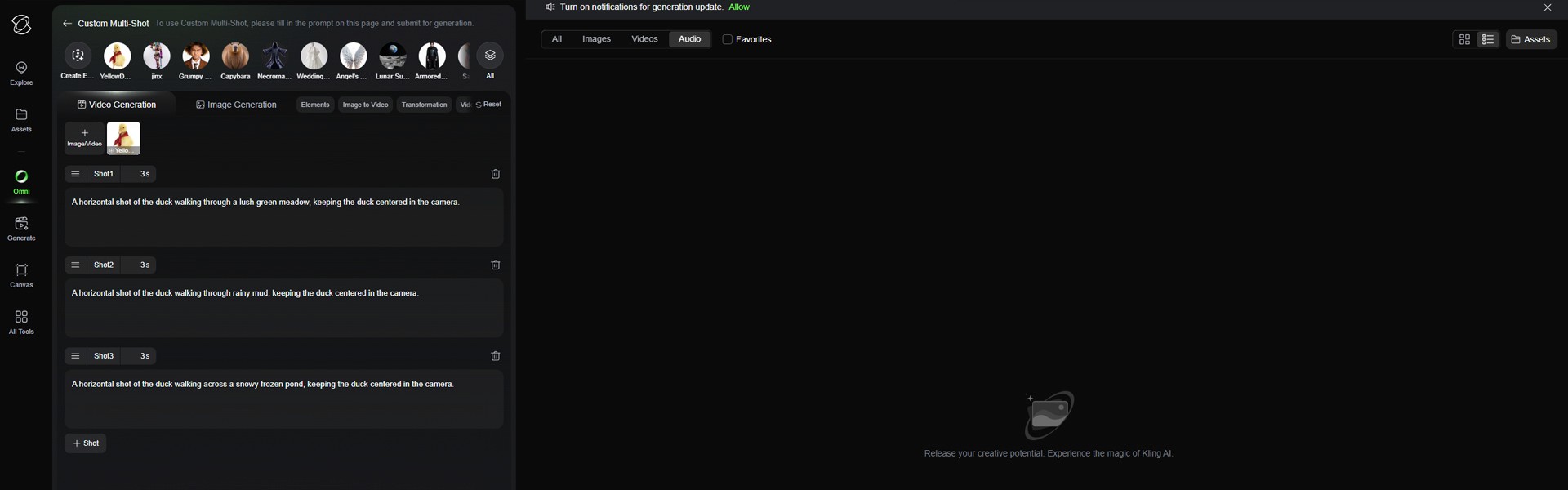 There’s no need to cut and stitch videos together in an external editor anymore. We’re going to use Omni’s core feature today, 'Multi-Shot', to set up dramatic background changes while the duck keeps walking.