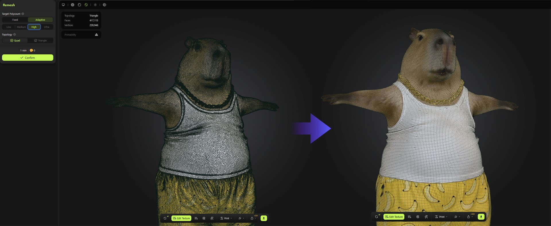 Click [Confirm]. The AI will calculate the direction of joint bends and flawlessly rearrange the surfaces mainly into quads (retopology).