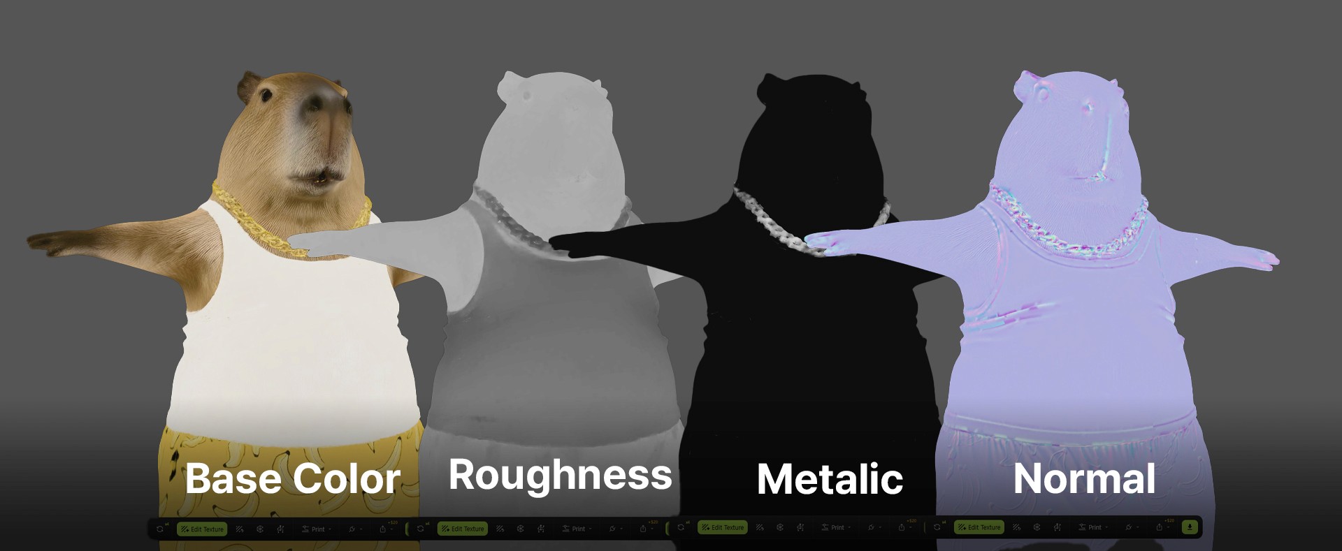 The AI automatically generates not only the original colors (Base) but also the Roughness, Metallic properties, and a Normal Map that depicts bumps and wrinkles in 3D, wrapping your model perfectly!