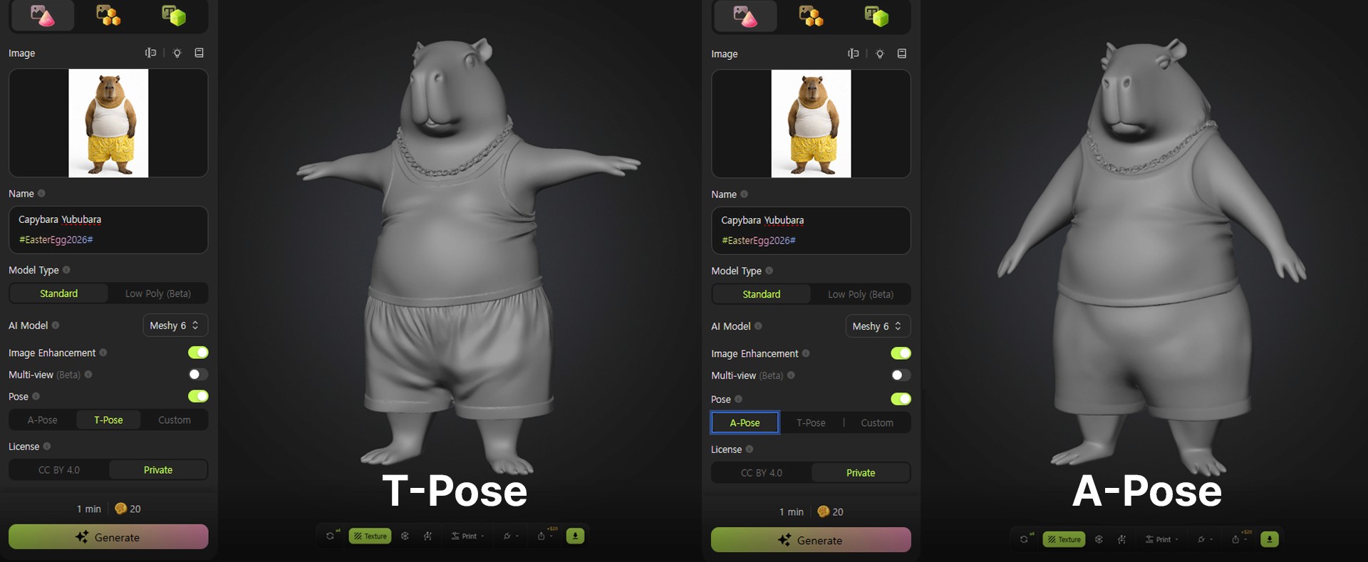 You can also simply upload a standard frontal photo, and in Meshy AI's settings, select the T-pose or A-pose option to force it into that 3D posture! Of course, if you can draw and upload the illustration in a T-pose or A-pose from the start, the AI will recognize the shape much more perfectly.