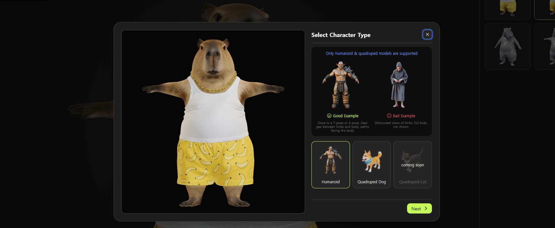Select Character Type: Since our Capybara stands on two feet and wears clothes, select Humanoid from the example silhouettes and click [Next].
