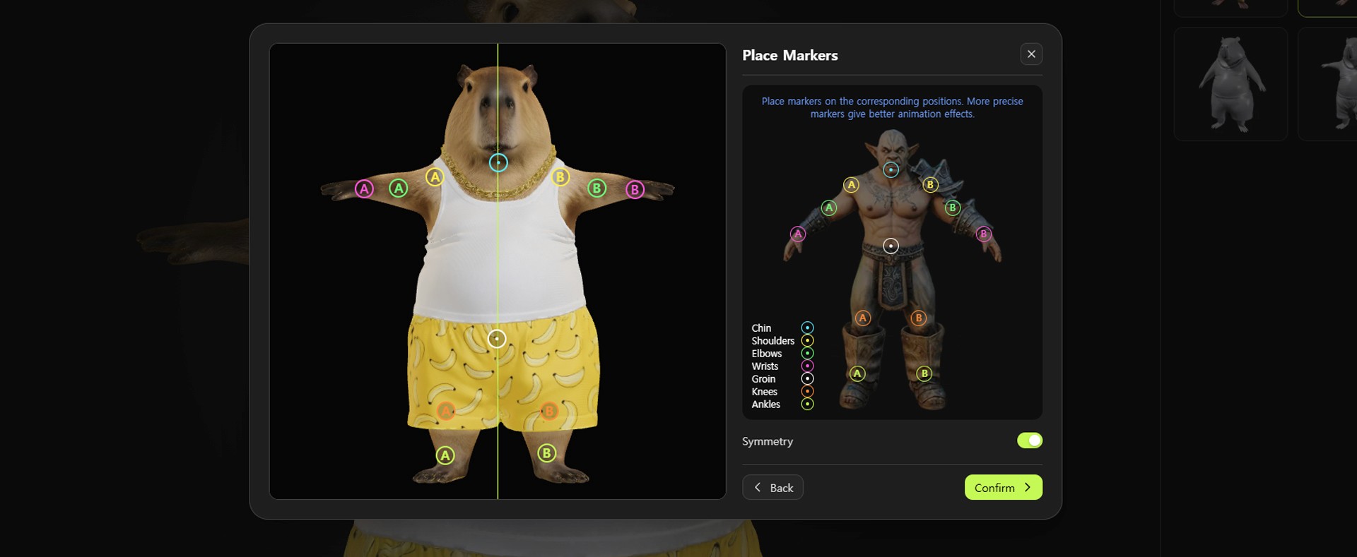 Place Markers: Following the proportions of the guide silhouette on the right, drag and drop the markers to the correct joint locations on the Capybara.