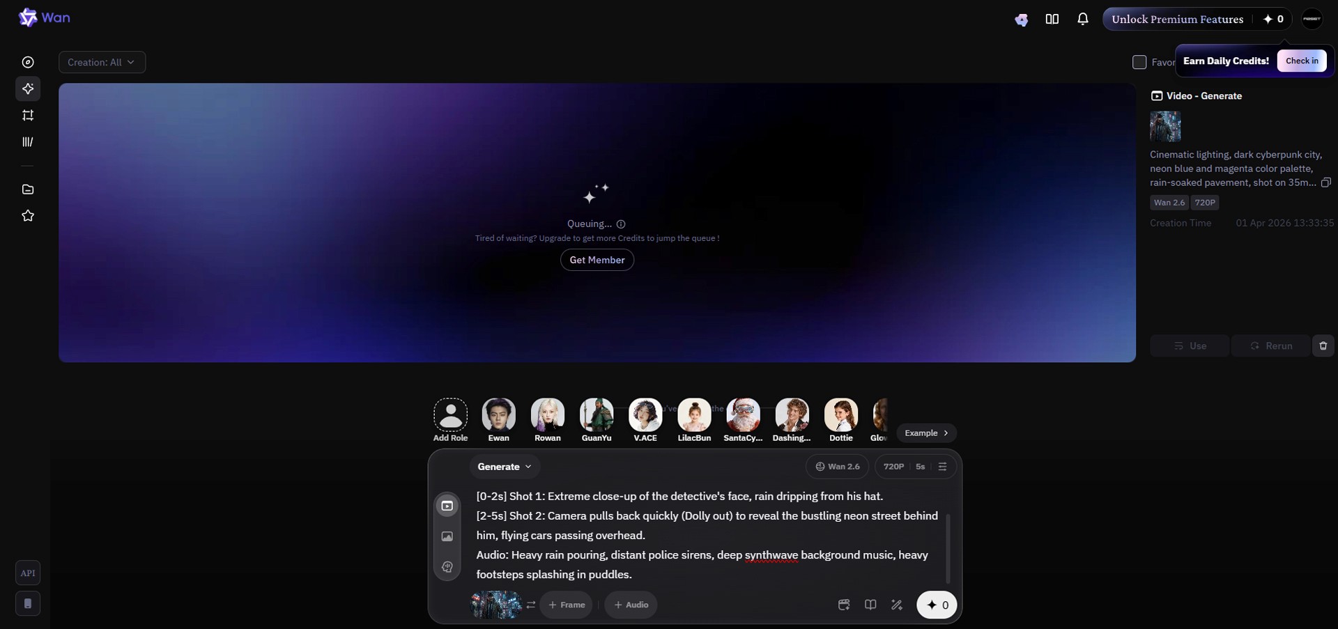 Play the result. Watch how naturally the scene cuts transition even within a short 5-second window—the first 2 seconds showing a tight close-up of the face, and the next 3 seconds smoothly pulling the camera back to reveal a wider view of the space. Unlike older AI models where forcefully moving the camera would warp or melt the subject's limbs, Wan 2.6 calculates the actual 3D physical space, maintaining flawless character consistency. You will also notice perfectly synchronized sound effects playing in time with the visual cues of the video (e.g., the rainfall and passing cars).