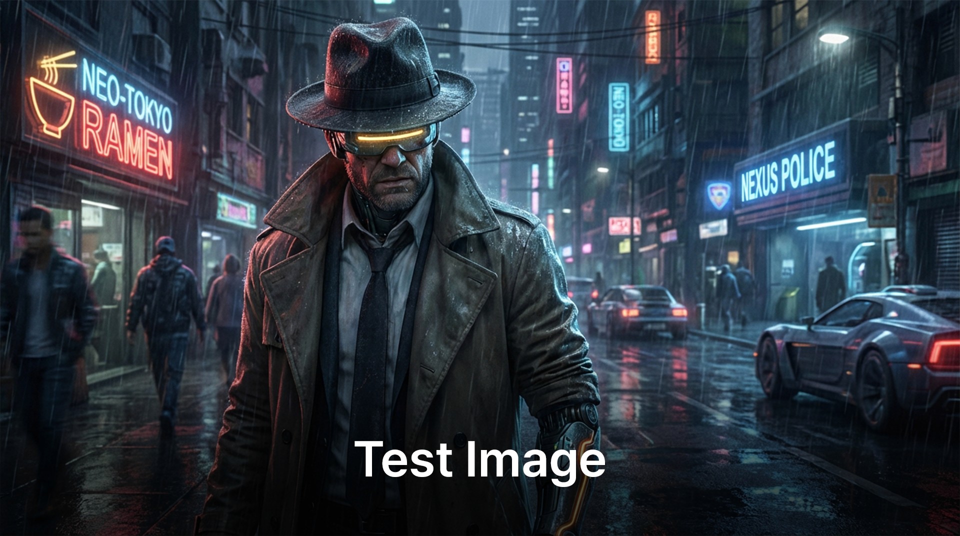 [0-2s]Shot 1: Extreme close-up of the detective's face, rain dripping from his hat.[2-5s]Shot 2: Camera pulls back quickly (Dolly out) to reveal the bustling neon street behind him, flying cars passing overhead.