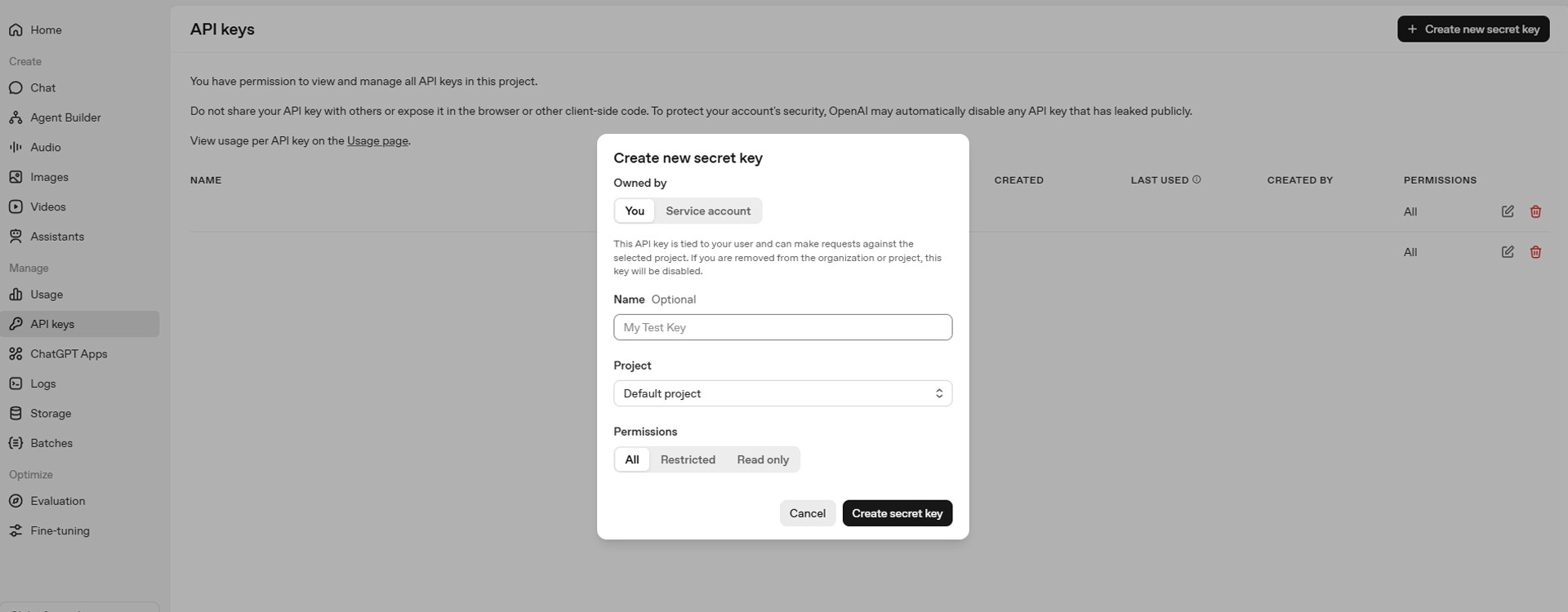 Go to the OpenAI API Billing Page, charge a minimum of $5, then generate and copy a new API key (sk-...) from the API keys menu.