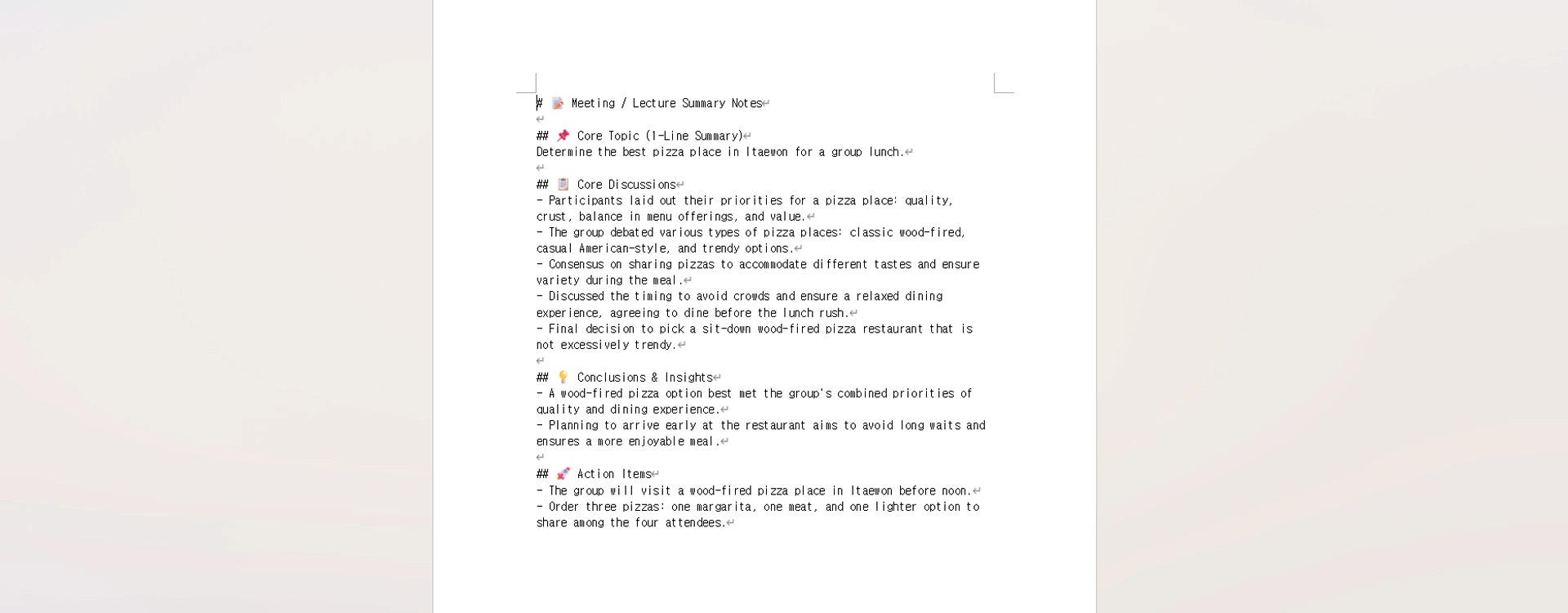 Did you see the chaotic conversation perfectly organized into 'Core Topics', 'Core Discussions', and 'Action Items' in the terminal?